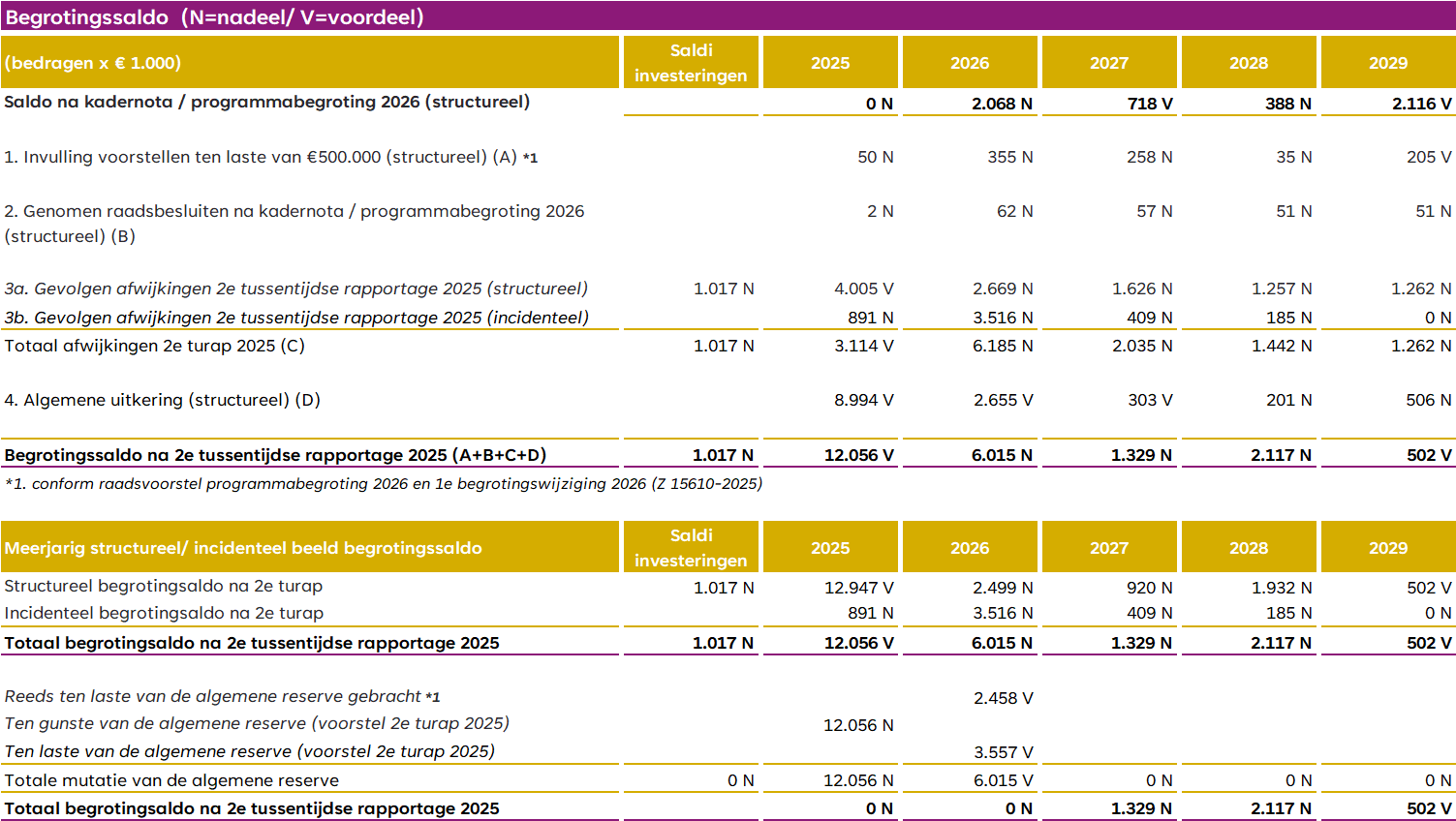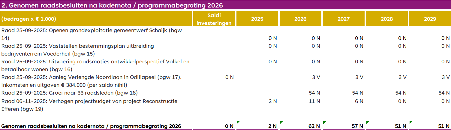 Onderstaand een actualisatie van het bestedings- en dekkingsplan 2025-2029 zoals gepresenteerd in de kadernota en programmabegroting 2026 van de gemeente Maashorst. De nieuwe ontwikkelingen met financiële gevolgen worden hieronder verder toegelicht. We presenteren financiële afwijkingen altijd naar structureel en incidenteel. Dit heeft te maken met het gegeven dat structurele afwijkingen gedekt moeten worden door structurele inkomsten. Denk bij deze inkomsten aan 'de algemene uitkering uit het Gemeentefonds' en jaarlijkse inkomsten uit heffingen en belastingen.