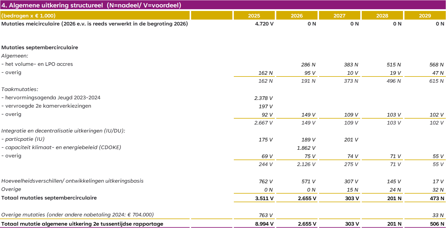 en de decembercirculaire is gebaseerd op de Najaarsnota en sluit het uitkeringsjaar zo goed mogelijk af. De septembercirculaire 2025 is op 16 september verschenen. In bovenstaand tabel is de verwerking van deze circulaire weergegeven. De meicirculaire 2025 moet nog dit jaar worden verwerkt in het lopende boekjaar. De raad is hierover geïnformeerd. Deze verwerking levert een voordeel op van € 4,72 miljoen. Met de septembercirculaire ontvangt de gemeente Maashorst aanvullende middelen. Het gaat om € 2,38 miljoen compensatie voor tekorten op de jeugdzorg over 2023 en 2024, € 197.000 voor de uitvoering van de vervroegde Tweede Kamerverkiezingen, en een positieve bijstelling van de integratie-uitkering Participatie van € 175.000. Daarnaast wordt het volume- en LPO-accres bijgesteld: € 704.000 voor 2024 en € 762.000 voor 2025. Deze aanpassingen leiden tot een gunstig financieel beeld in 2025. Wel geldt dat de extra middelen voor jeugdzorg incidenteel zijn en vooral bedoeld om eerdere tekorten te compenseren.