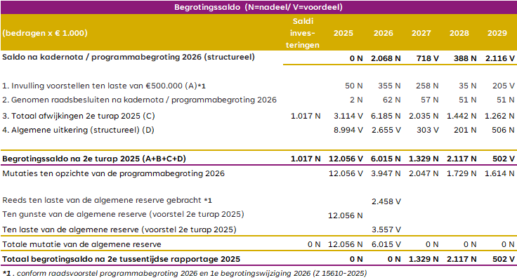 In deze tweede tussentijdse rapportage wordt voor 2025 een positief begrotingssaldo van € 12,1 miljoen verwacht. Dit resultaat komt voort uit combinatie van bijstellingen in de programma’s, genomen raadsbesluiten en een hogere algemene uitkering.