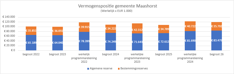 In de grafiek is zichtbaar dat de reservepositie van de gemeente Maashorst redelijk stabiel is. De begrote reserves in 2026 nemen af. Dit wordt vooral veroorzaakt door nadelige meerjarensaldi die ten laste komen van de Algemene reserve.
