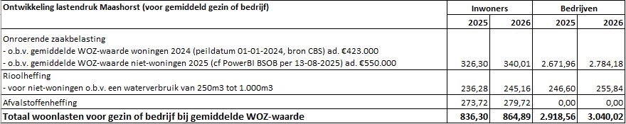 Terug naar navigatie - Samenvatting Programmabegroting - 5. Ontwikkeling Lastendruk inwoners/bedrijven 2026In de paragraaf Lokale Heffingen zijn al onze belastingen en heffingen toegelicht. Hieronder een overzicht van de ontwikkeling van de lastendruk 2025--> 2026.